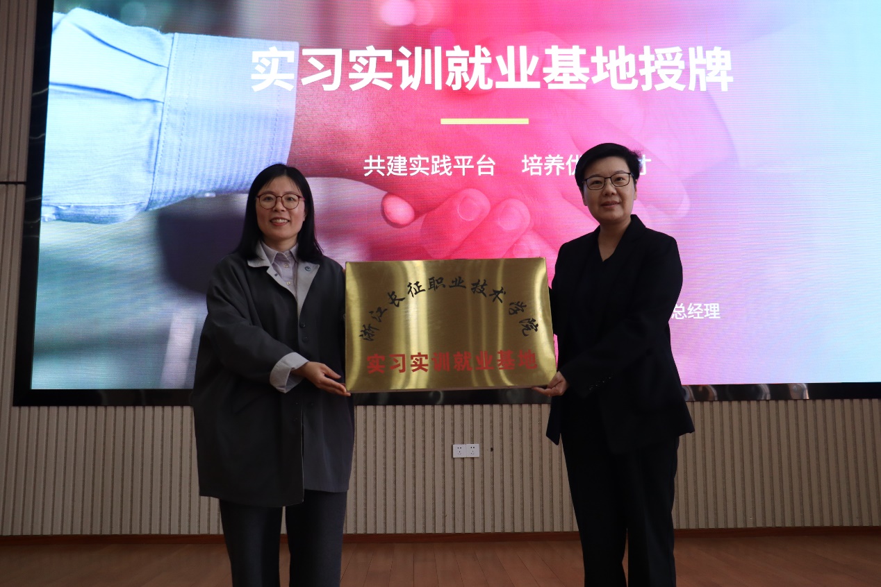 紧接着,举行了隆重的授牌与揭牌仪式。王赟总经理与张晓燕处长共同为“实习实训就业基地”授牌;