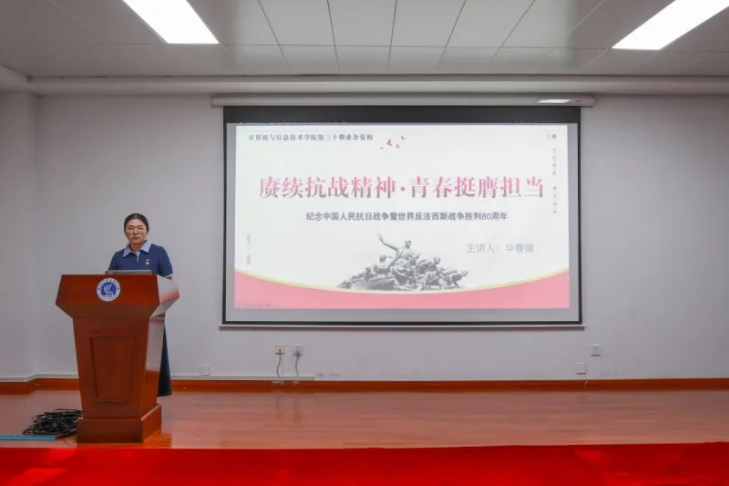 10 月 14 日下午,计算机与信息技术学院第三十期业余党校第四课在图书馆 403 教室开讲,学工办主任华春媛老师以 “赓续抗战精神・青春挺膺担当” 为主题主讲。课上,华老师通过 “历史脉络 + 鲜活故事” 的 PPT 形式,带学员回顾从 “九一八事变” 到抗战胜利的征程,借历史与英雄故事展现中华儿女英雄气概,让学员感受抗战意义与精神分量;随后她聚焦当代青年使命,指出抗战精神是新时代青年的精神坐标和力量源泉,号召大学生将赓续精神与青春担当相结合。