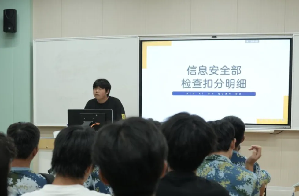 宣讲伊始,生活部通过 “差寝照片” 直观呈现卫生不达标问题,强调寝室整洁的重要性,同时明确地面、桌面、床铺等区域的卫生检查标准及检查时间,让新生清晰掌握寝室卫生规范。信息安全部则重点强调寝室管理要求:严禁使用电饭煲、热得快等违规电器,禁止私养宠物,此类行为既违校规又存重大安全隐患;还详细解读检查扣分明细,提醒新生重视个人信息保护与网络安全,避免信息安全损失。
