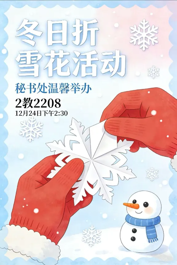 冬日凛风送寒,却挡不住对美好与温情的追寻。为丰富课余生活,营造温暖治愈的冬日氛围,秘书处将于本周三下午两点半,在2教2208教室举办「冬日折雪花」主题活动,诚邀全体同学共赴一场充满创意与温柔的冬日之约。