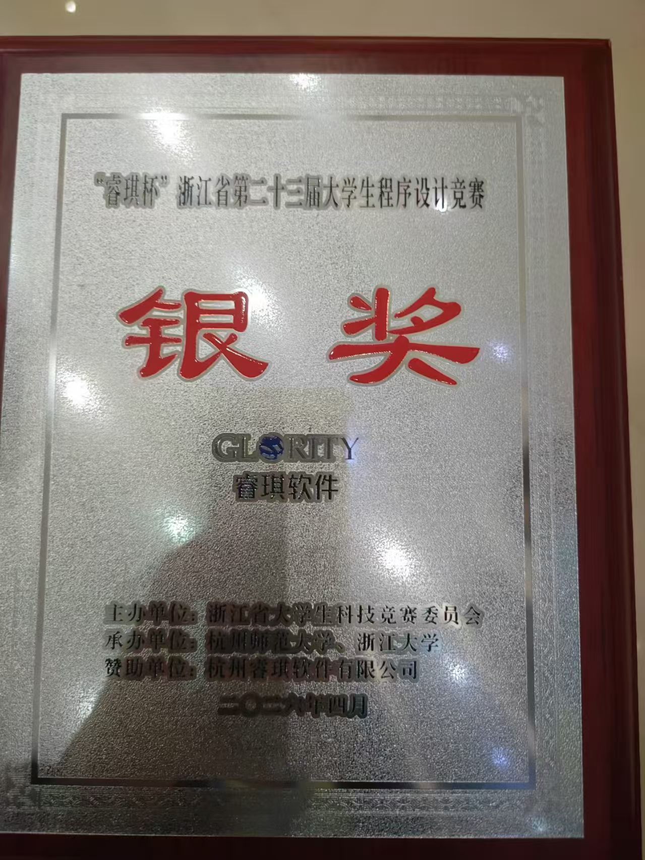 浙江省第二十三届大学生程序设计竞赛于2026年4月25日举行。我校计算机与信息技术学院的高兴媛、彭小玲老师带领团队参赛。经过5个小时的激烈角逐,由赵登峰(25软件技术)、朱宇豪(25软件技术)、朱怡帆(24计算机应用2)组成的代表队获得大专组银奖。